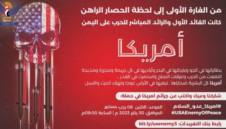 تنطلق الساعة التاسعة من مساء يوم غدٍ الاثنين، حملة تغريدات عبر موقع التواصل الاجتماعي “تويتر”، بعنوان من الغارة الأولى إلى لحظة الحصار الراهن .. أمريكا كانت القائد الأول والرائد المباشر للحرب على اليمن”.