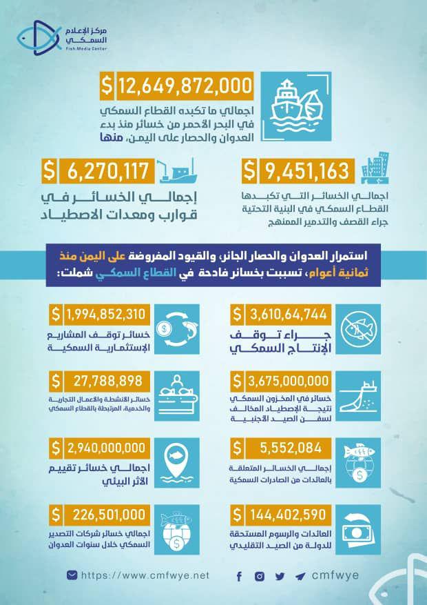 ووفقا لتقرير صادر عن وزارة الثروة السمكية بصنعاء فقد بلغ إجمالي ما تكبده القطاع السمكي في البحر الأحمر من خسائر، منذ بدء العدوان والحصار على اليمن،12 ملياراً و649 مليوناً و872 ألف دولار منها 9,451,163 دولاراً إجمالي الخسائر التي تكبدها القطاع السمكي في البنية التحتية، جراء القصف والتدمير.