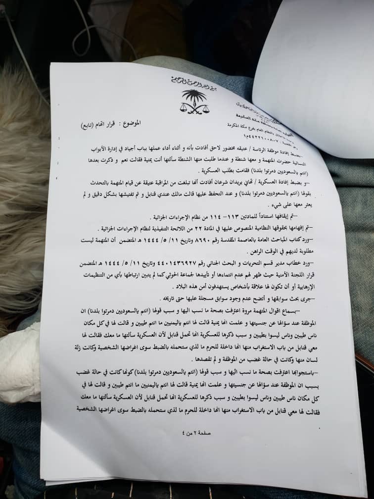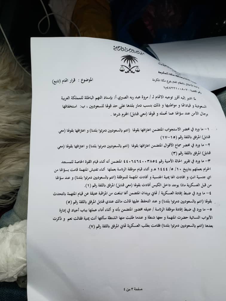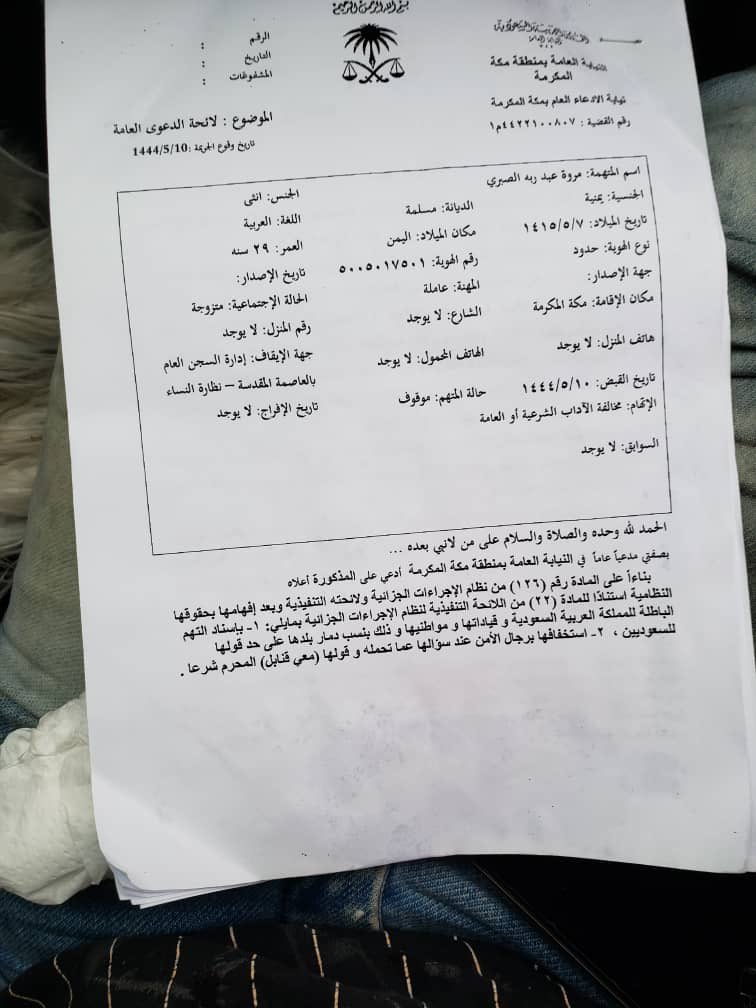 وأظهرت وثائق متداولة صادرة من النيابة العامة السعودية في مكة، هوية المرأة اليمنية، وكذلك محضر الأمن السعودي الذي قام باعتقالها بحجة اتهام السعوديين بتدمير اليمن، خلال زيارتها لأداء مناسك العمرة في مكة المكرمة.