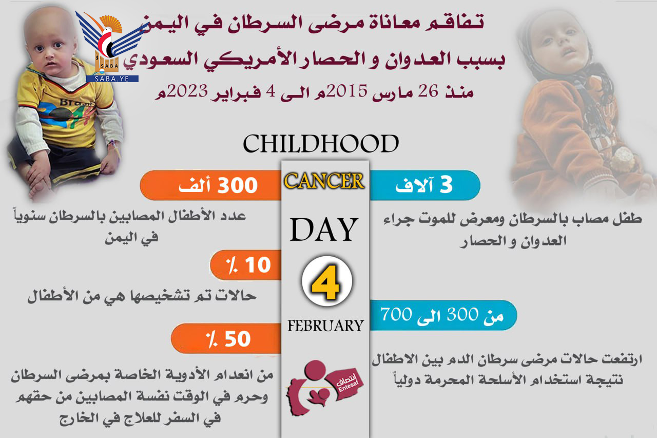 وأوضحت المنظمة في بيان أصدرته بمناسبة اليوم العالمي للسرطان 4 فبراير، أن عدد الأطفال المصابين بسرطان الدم في ارتفاع مستمر وبأرقام مهولة، حيث ارتفع من 300 حالة إلى 700 حالة بأمانة العاصمة صنعاء، نتيجة استخدام العدوان للأسلحة المحرمة دولياً في عطان ونقم بالإضافة إلى إصابة ألف طفل في بقية المحافظات.