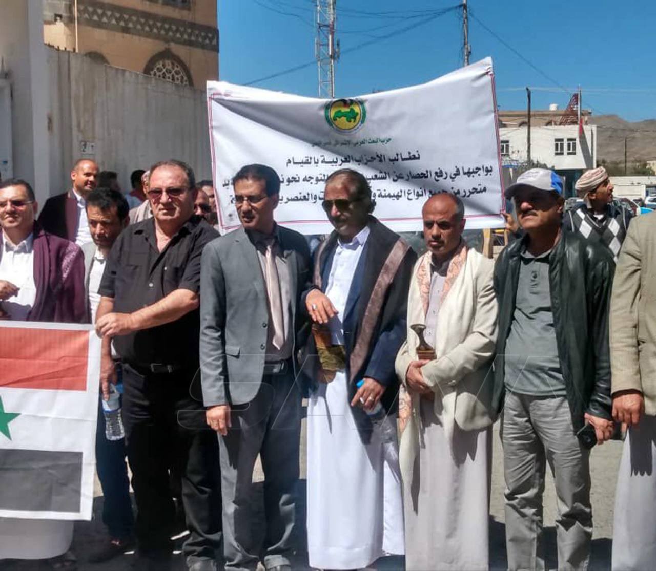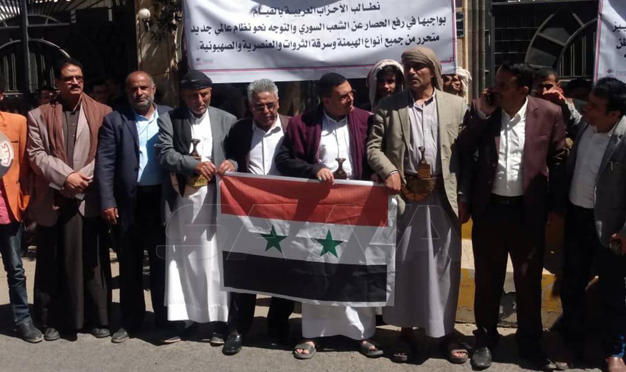 نظمّت الجبهة الثقافية لمواجهة العدوان وحزب البعث العربي الإشتراكي، اليوم الأحد، أمام السفارة السورية بصنعاء وقفة تضامنية مع الشعب السوري الشقيق تحت شعار “ارفعوا الحصار والعقوبات الأمريكية عن سوريا”.