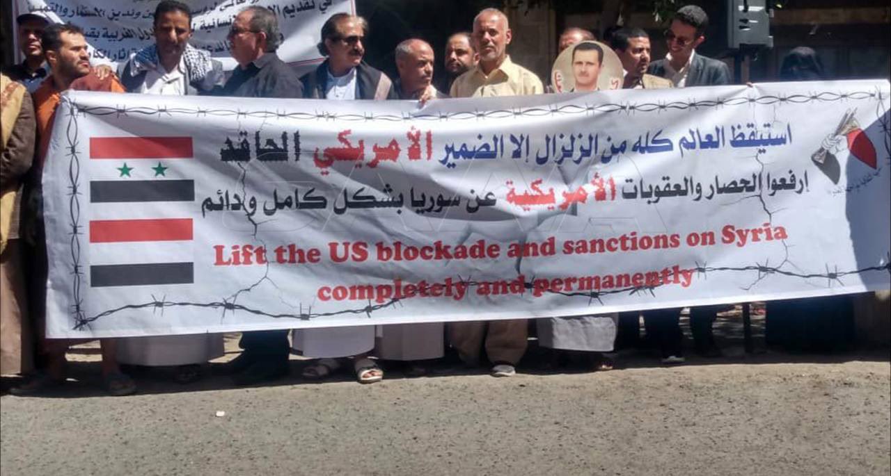 وطالب المشاركون في الوقفة التي تقدمها وزير حقوق الإنسان علي الديلمي وعضو مجلس الشورى الدكتور حزام الأسد ونواب وزراء الإعلام فهمي اليوسفي والتعليم العالي والبحث العلمي الدكتور علي شرف الدين والنقل محمد الهاشمي، ومسؤولي الأحزاب والمكونات السياسية وممثلي المنظمات الجماهيرية، بإنهاء الحصار ورفع العقوبات عن سوريا وضمان وصول المساعدات لمتضرري كارثة الزلزال الذي ضرب سوريا.