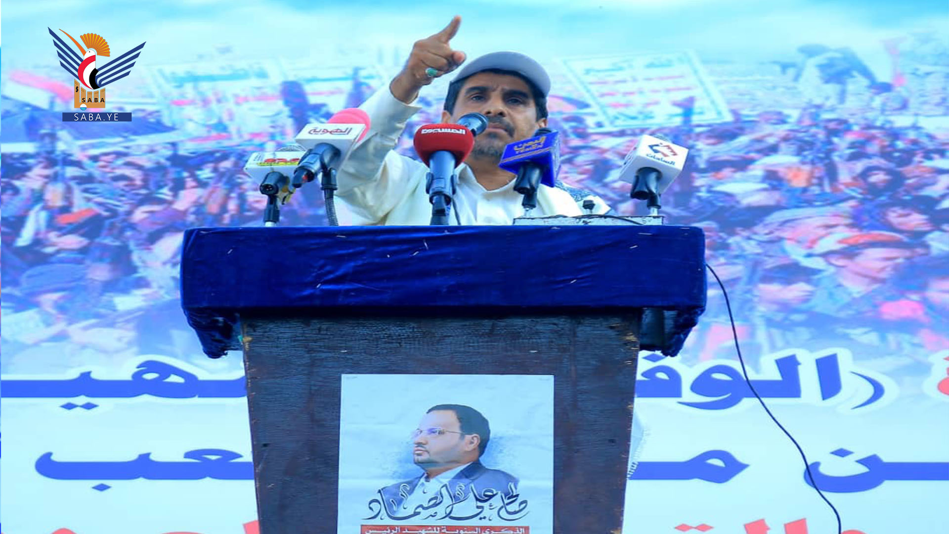 وأشار الى الدور الامريكي في اغتيال الشهيد الرئيس الصماد باعتباره من يخطط للسعودي ويرسم ويحدد أهداف ارتكاب الجرائم، لافتا الى أن الشعب اليمني سيظل يتذكر هذه الجريمة وكل الجرائم جيلا بعد جيل، والتى كشفت كل الادعاءات والتبريرات الزائفة التي تحاول أن تشرعن للعدوان.