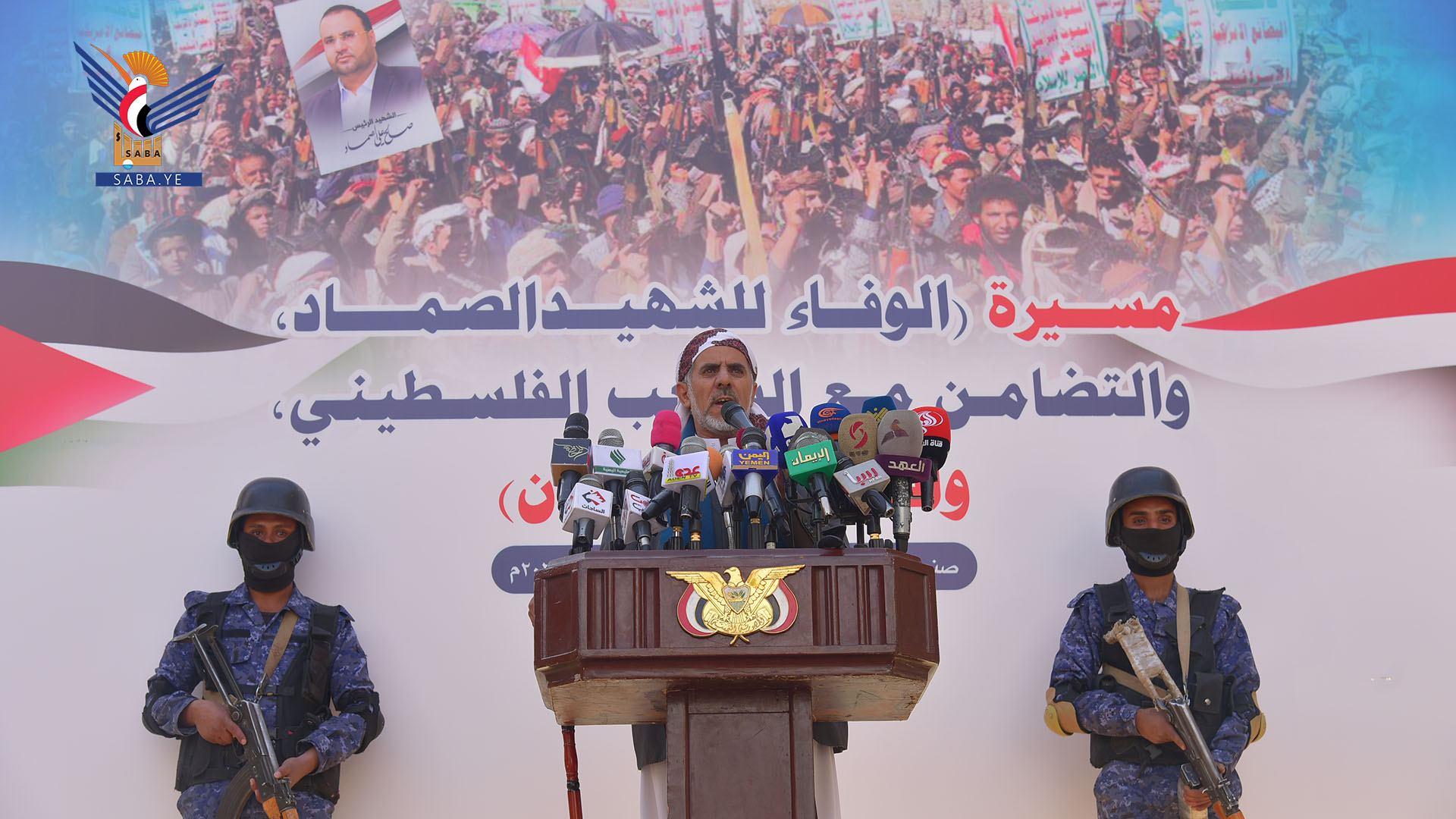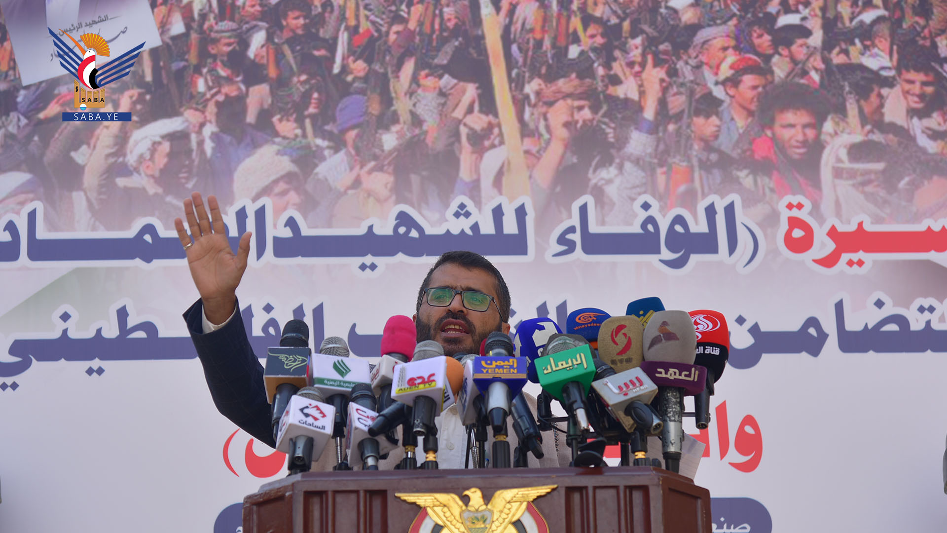 وأعلن تضامن ووقوف الشعب اليمني إلى جانب الشعب الفلسطيني كموقف مبدئي وإنساني وديني لا يمكن أن يتغير مهما كان العدوان على اليمن، مؤكدا أن ما تعرض له اليمن من استهداف هو نتيجة لموقفه وما سيكون له من دور فاعل وعملي في تحرير فلسطين.