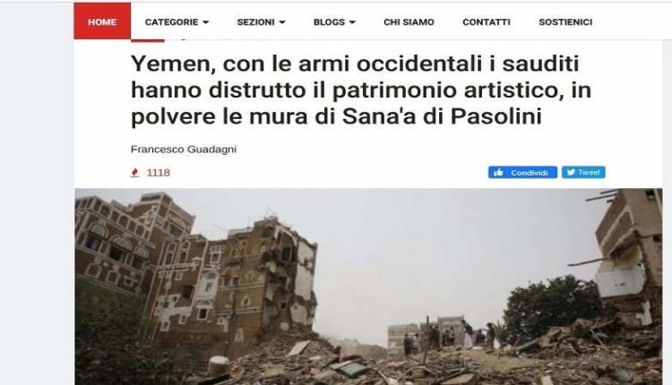 أكدت صحيفة إيطالية أن السعوديين دمروا بالأسلحة الغربية التراث الفني اليمني وأسوار صنعاء، إلى جانب تدميرهم للبنية التحتية وتسببهم في أكبر أزمة إنسانية.