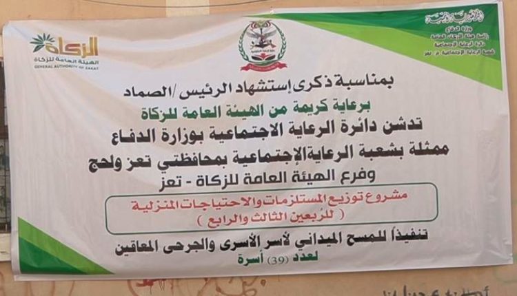 التدشين تم لعدد 39 أسرة من أسر الأسرى والجرحى والمعاقين لمحافظتي تعز ولحج بحضور ممثلين عن السلطة المحلية وشعبة الرعاية الاجتماعية بوزارة الدفاع والمكتب الإشرافي لأنصار الله.