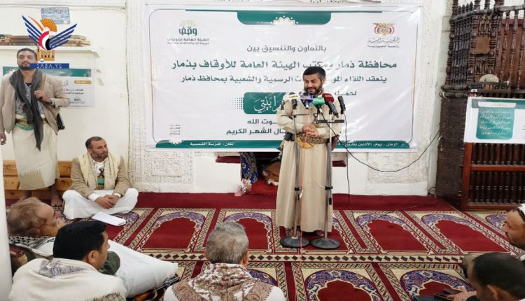 نظم مكتب الهيئة العامة للأوقاف بمحافظة ذمار بالتنسيق مع السلطة المحلية بالمحافظة اليوم، لقاءاً موسعاً للعلماء والخطباء والمرشدين، ضمن حملة ” أن طهرا بيتي” لتجهيز بيوت الله استعدادا لاستقبال الشهر الكريم.