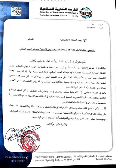 وقالت غرفة وتجارة الأمانة، في رسالتها: ” أن القطاع الخاص سيكون جنباً إلى جنب مع اللجنة الاقتصادية العليا والجهات المعنية في كافة الإجراءات القانونية التي تتخذها بشأن قضايا القطاع الخاص”.. مقدمة شكرها لما تقوم به الجهات الرسمية والقضائية في الحفاظ على الأمن والطمأنينة الاقتصادية في بلادنا، خصوصاً لرجال المال والاعمال ذات الانتماء الوطني.