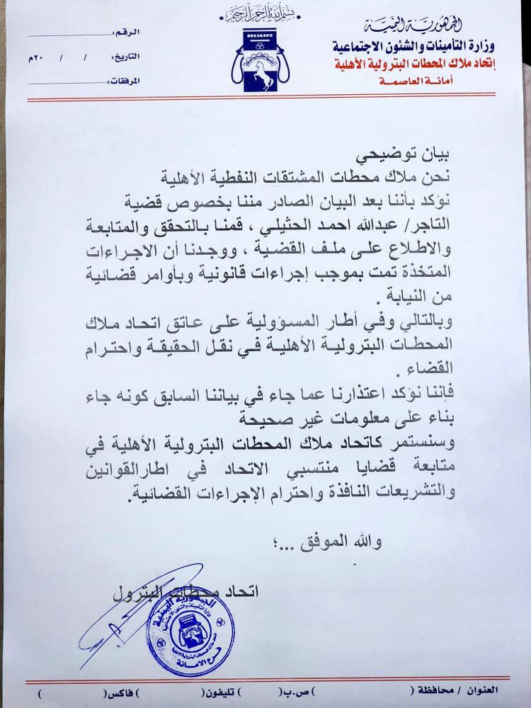 هذا وتأتي مذكرة الغرفة التجارية والصناعية في الأمانة، وبيان اتحاد ملاك محطات المشتقات النفطية الأهلية تعقيباً على بيانان منفصلان قد صدرا عنهما في وقت سابق وفق ما قالا عنه معلومات مغلوطة قدمت لهما من قبل التاجر “الحثيلي”.