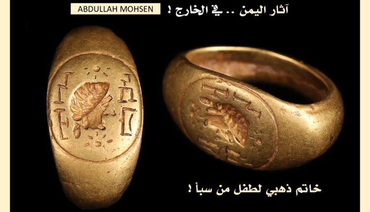 قال الباحث في الآثار اليمنية عبدالله محسن، إن خاتم لطفل من سبأ من الذهب اليمني القديم يعرض للبيع في إحدى دور عرض الفنون الأوروبية.