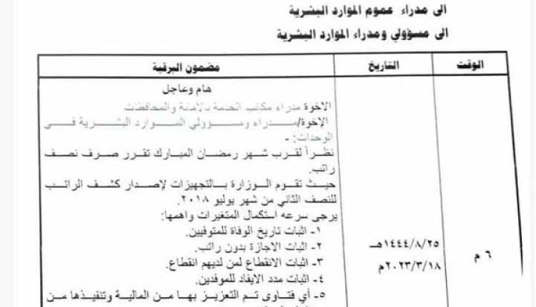 أصدرت وزارة الخدمة المدنية والتأمينات تعميما بشأن صرف النصف الثاني من مرتب شهر يوليو ٢٠١٨م لجميع وحدات الخدمة العامة التي لم يسبق الصرف لها.
