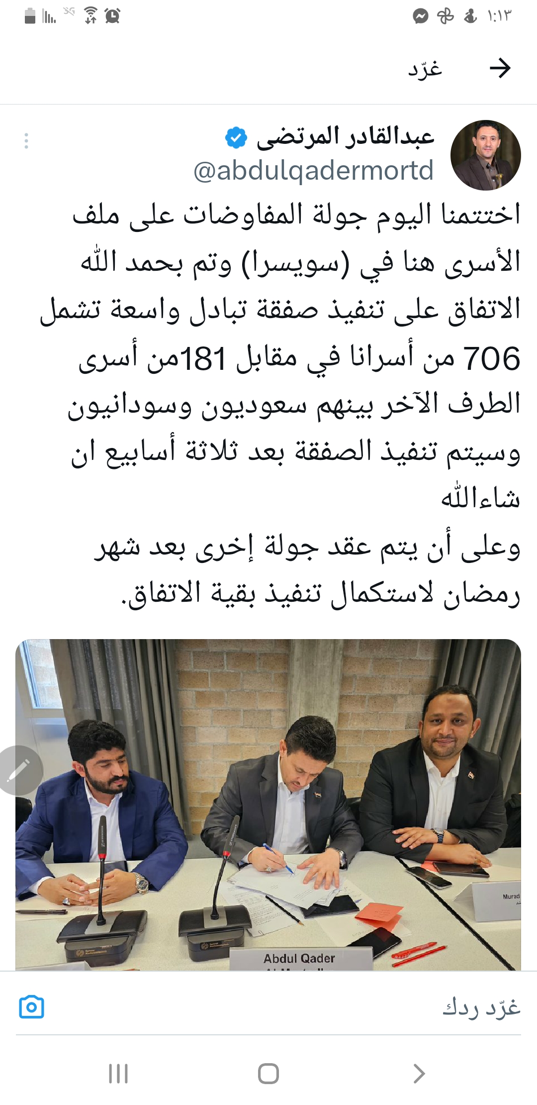 من جانبة اوضح رئيس لجنة الأسرى عبدالقادر المرتضى ان الاتفاق يتم تنفيذة خلال الثلاثة الاسابيع القادمة.