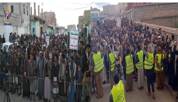 ورفع المشاركون في المسيرة اللافتات والشعارات المنددة والمستنكرة باستمرار العدوان الأمريكي السعودي والحصار على الشعب اليمني منذ ثماني سنوات.
