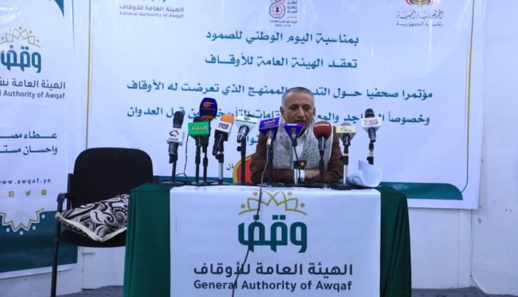 في مؤتمر صحفي للهيئة العامة للأوقاف اليوم بـ صنعاء، كشفت الهيئة خلاله عن جملة من الإحصائيات والأرقام للتدمير الممنهج للأوقاف وخصوصاً المساجد والمقامات من قبل العدوان خلال ثمان سنوات من العدوان والحصار.