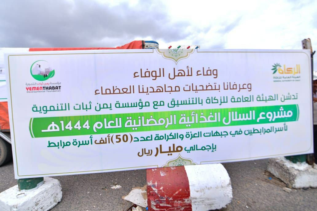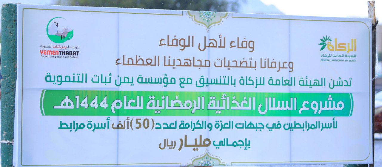 ونوه بضرورة دعم وتعاون ومسؤولية الجميع في الجانب الرسمي والشعبي أمام المرابطين العظماء وتضحياتهم الكبيرة في مواجهة العدوان والدفاع عن الوطن،مشيداً بكل الجهات التي تقدم الدعم لمؤسسة يمن ثبات وعلى رأسها الهيئة العامة للزكاة لدعمهم الكبير مختلف مشاريع المؤسسة الغذائية والصحية ومشاريع العفاف والغارمين وغيرها.