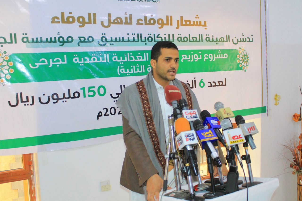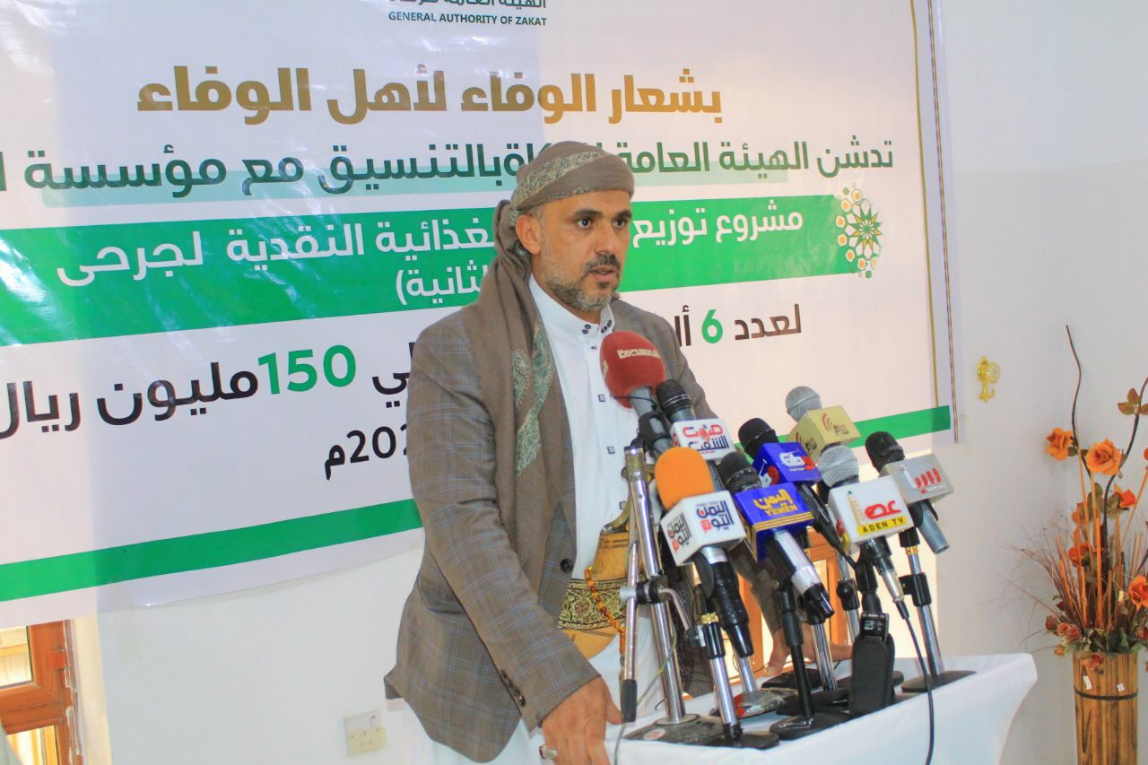 دشنت الهيئة العامة للزكاة الخميس بصنعاء، بالتنسيق مع مؤسسة الجرحى، مشروع توزيع السلال الغذائية النقدية لعدد 6 آلاف جريح “الفئة الثانية” بتكلفة إجمالية بلغت 150 مليون ريال تحت شعار ” الوفاء لأهل الوفاء”.