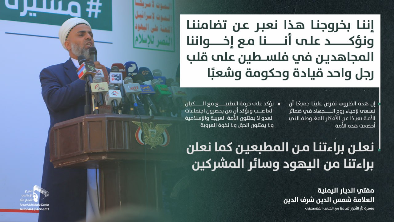 وقال العلامة شرف الدين: “إن الشعب اليمني الحر صاحب هوية إيمانية وإسلامية ينطلق من نهج القرآن الكريم وهدي النبي الأعظم، ليؤكد على الموقف الدائم تجاه قضايا الأمة وفي المقدمة فلسطين والقدس الشريف”.