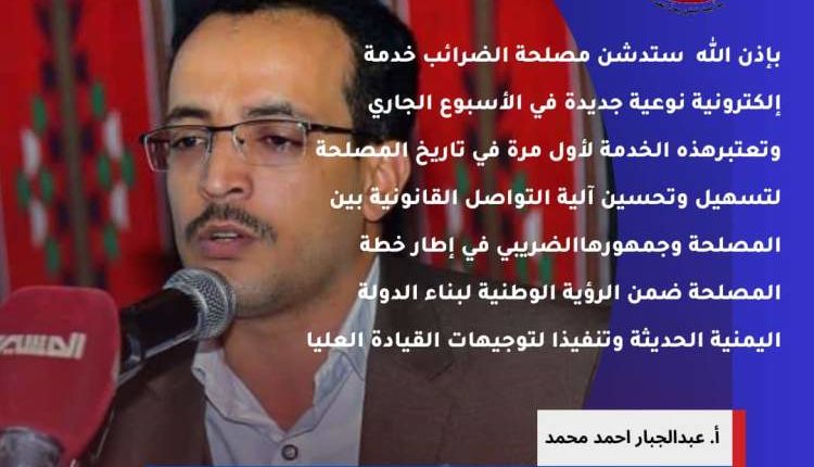اعلن رئيس مصلحة الضرائب عبدالجبار احمد عن عزم المصلحة تدشين انجاز جديد الاسبوع الجاري يعد الاول من نوعه في تاريخ المصلحة.
