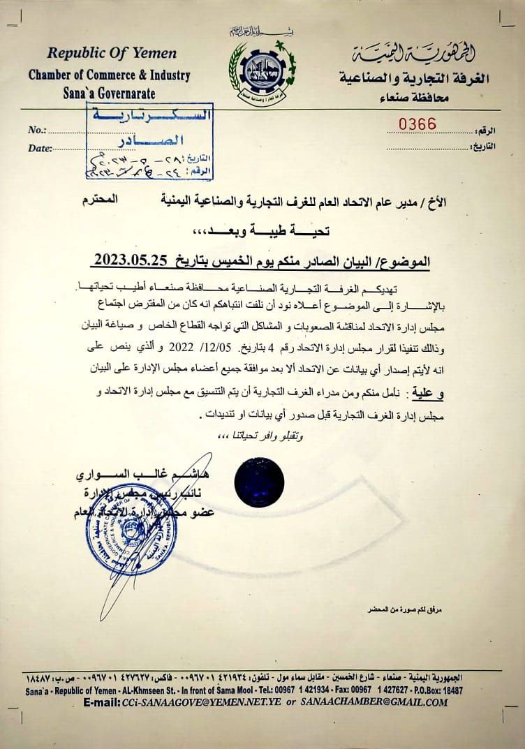 وقالت الغرفة التجارية بمحافظة صنعاء في مذكرة خطاب وجهتها لمدير عام اتحاد الغرف التجارية والصناعية:
