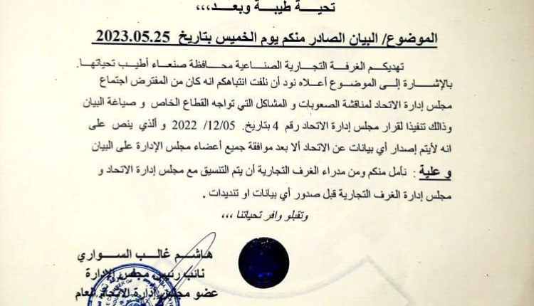 وقالت وثيقة الغرفة التجارية بمحافظة صنعاء في مذكرة خطاب وجهتها لمدير عام اتحاد الغرف التجارية والصناعية بالأمانة -حصل يمني برس على نسخة منه: