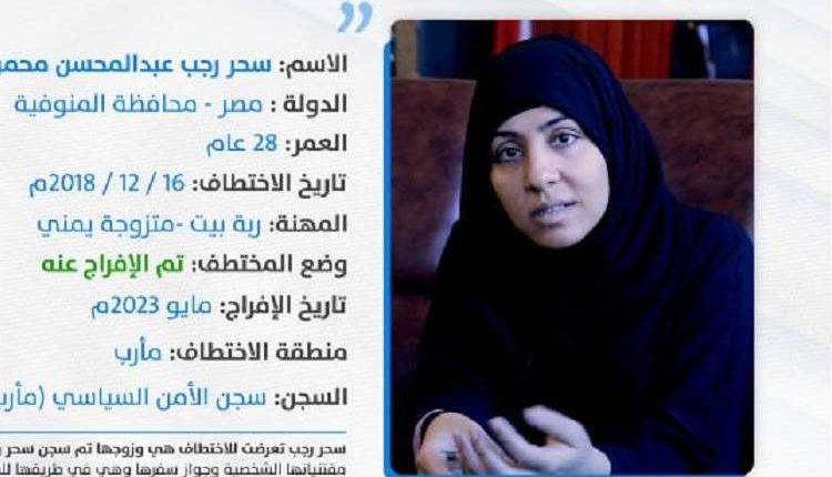 وأوضحت المنظمة في بيان لها “إن المواطنة المصرية سحر رجب عبد المحسن، متزوجة من مواطن يمني وابنتها سماء البالغة من العمر خمس سنوات وصلتا للمنظمة، وأفادت سحر بأنه تم اختطافها في ١٦ ديسمبر ٢٠١٨م وهي حامل في الشهر السادس أثناء سفرها من مطار سيئون إلى محافظة إب مسقط رأس زوجها.