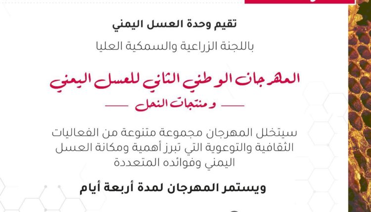 ولفت الأشموري إلى أن المهرجان يعد فرصة لتنمية قطاع العسل، ودعماً للاقتصاد اليمني من خلال نشر ثقافة المنتج، وتسويقه وترويجه، داعيا تجار العسل والمؤسسات الحكومية والشركات التجارية ومنتجي ومسوقي العسل اليمني وكافة أفراد المجتمع، إلى المشاركة الفاعلة في فعاليات المهرجان، حاثاً وسائل الإعلام للتوعية بأهمية تنمية وحماية العسل اليمني.