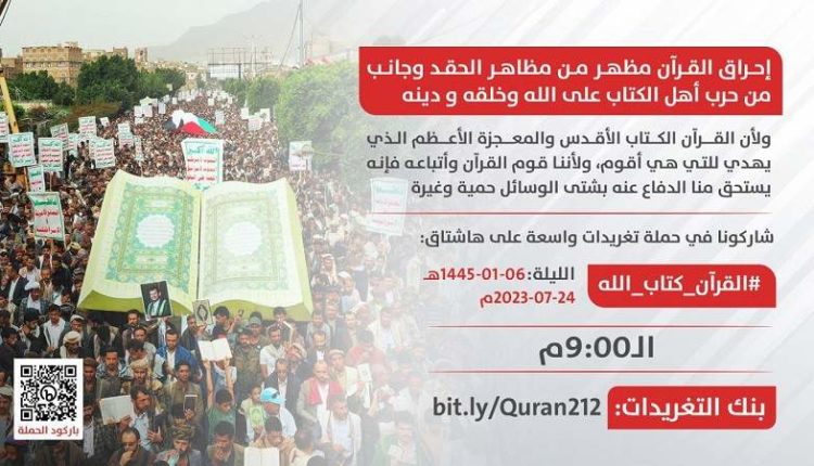 تنطلق في الساعة (09:00) مساء اليوم الاثنين حملة تغريدات على موقع التواصل الاجتماعي تويتر، للتنديد بجرائم إحراق القرآن الكريم والتعبير عن الغضب والرفض لهذه الإساءات التي تمس أهم المقدسات الإسلامية.