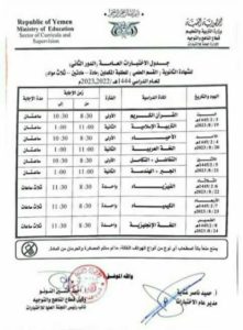 ونشرت الوزارة جداول الاختبارات للقسمين العلمي والأدبي، وهي كالتالي:
