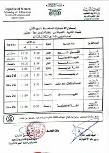 أعلنت وزارة التربية والتعليم عن  بدء اختبارات الدور التكميلي لطلاب الشهادة الثانوية ـ بقسميها العلمي والأدبي للعام الدراسي ١٤٤٤ﮪ، في أمانة العاصمة والمحافظات.