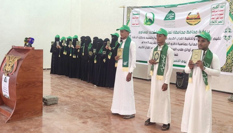 نظمت إدارة تعليم وتحفيظ القرآن بمكتبي التربية والتعليم والإرشاد بمحافظة تعز، اليوم الخميس ، فعالية بذكرى المولد النبوي الشريف، وتكريم أوائل طلاب المرحلة التكميلية.