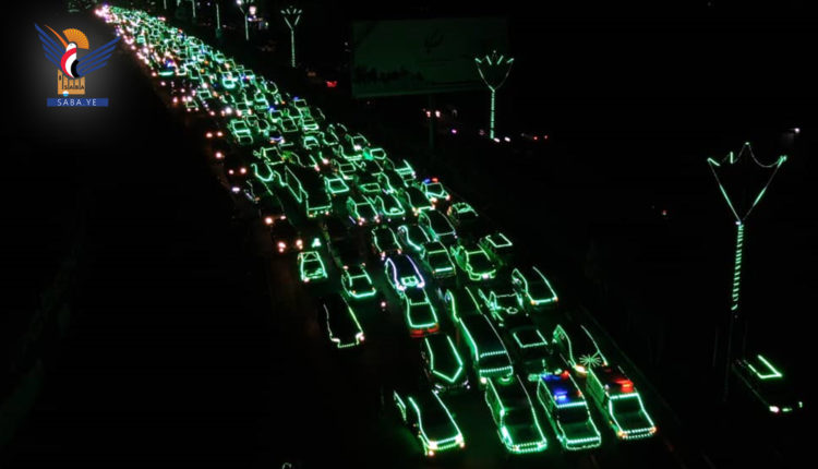 نظمت السلطة المحلية بمحافظة تعز مسيرة ضوئية لمئات السيارات المزينة بالألوان والأعلام الخضراء، احتفاءً بذكرى المولد النبوي الشريف.