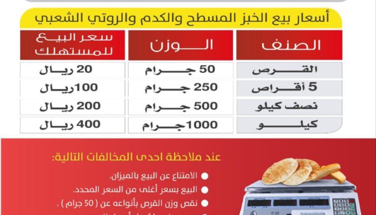 قال وكيل وزارة الصناعة والتجارة لقطاع التجارة الداخلية محمد قطران ، ان الوزارة ومكاتبها في أمانة العاصمة والمحافظات وفروعها في المديريات ستنفذ حملة واسعة ابتداء من يوم غد الأحد ، للتأكد من الالتزام بقرار الوزارة بتحديد سعر الكيلو جرام الخبز بمبلغ 400 ريال وان لايقل حجم القرص لواحد عن 50 جرام .