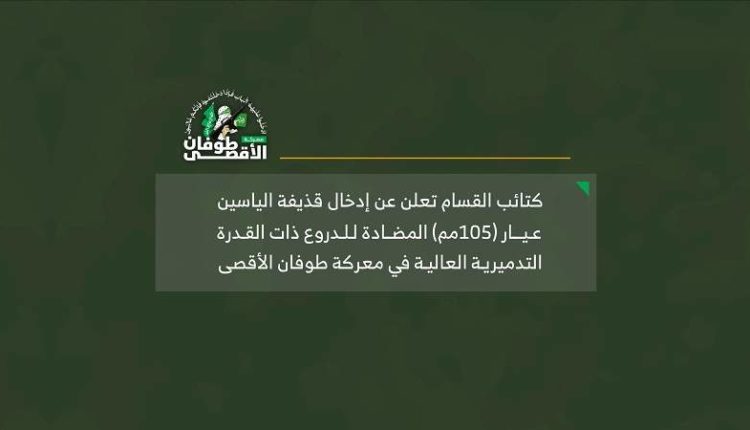 كشفت كتائب القسام عن قذيفة “الياسين” محلية الصنع المضادة للدروع من عيار 105 ملم، وهي قذيفة ترادفية ذات قدرةٍ تدميريةٍ عالية، ودخلت الخدمة خلال معركة طوفان الأقصى.