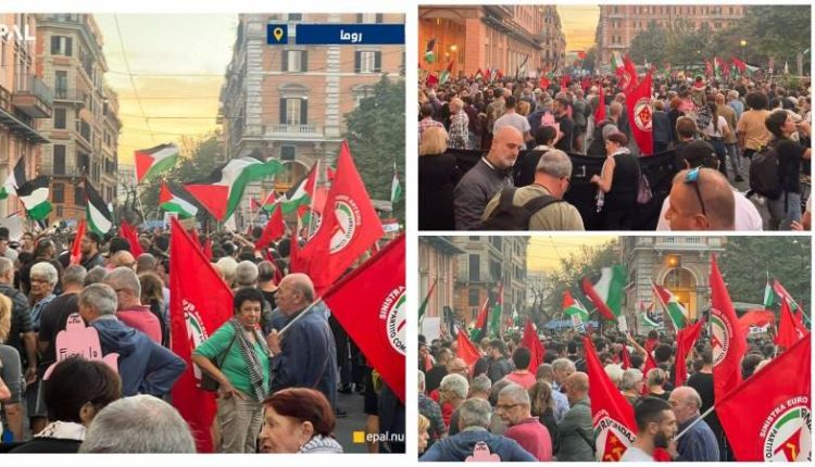 جابت مسيرة حاشدة بمشاركة الآلاف شوارع العاصمة الإيطالية روما، نظمتها الجالية الفلسطينية، وجمعية الطلاب الفلسطينيين في إيطاليا، بالتنسيق مع قوى التضامن مع الشعب الفلسطيني، تنديدا بالعدوان الصهيوني على غزة والضفة الغربية.