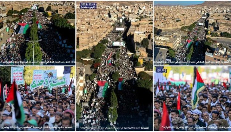 وكان الطوفان البشري الثامن بالعاصمة صنعاء في الأول من ديسمبر الجاري، فضلاً عن مئات المسيرات والتظاهرات في مختلف المحافظات اليمنية على مدى الأسابيع الماضية منذ الإعلان عن معركة طوفان الأقصى.