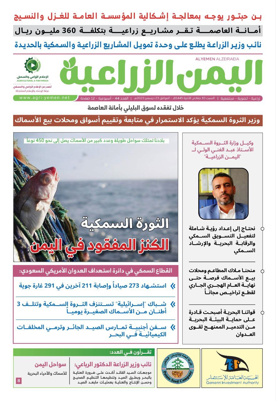 صدر العدد “44” من صحيفة “اليمن الزراعية، متضمناً عدداً من الملفات الزراعية وعلى وجه الخصوص في القطاع السمكي والكنز المفقود لعقود من الزمن.