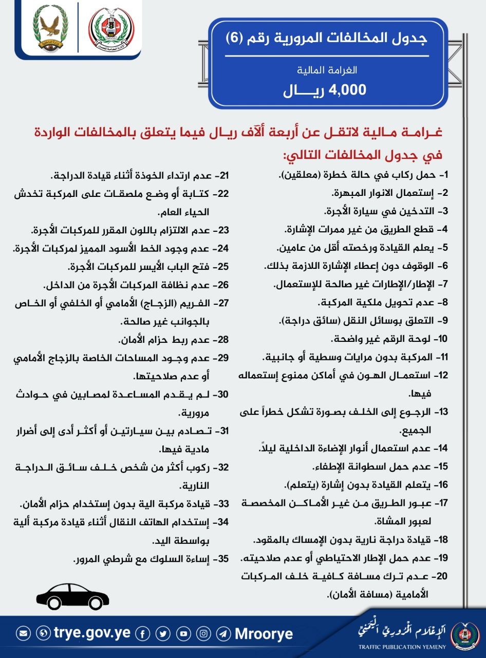 جدول المخالفات المرورية رقم (6) On ديسمبر 29, 2023 776 Share جدول المخالفات المرورية رقم (6) بغرامة 4000 ريال على المخالفات الأتية : 776 Share FacebookTwitterGoogle+ReddItWhatsAppPinterestEmail