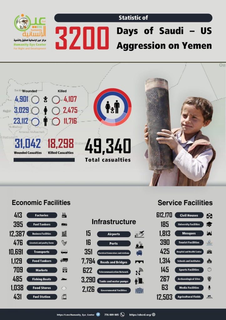 وأكد المركز في إحصائيته استشهاد وإصابة 49340 مدني خلال 3200 يوم من العدوان الأمريكي السعودي بينهم 18298 شهيداً و31042 جريحاً.