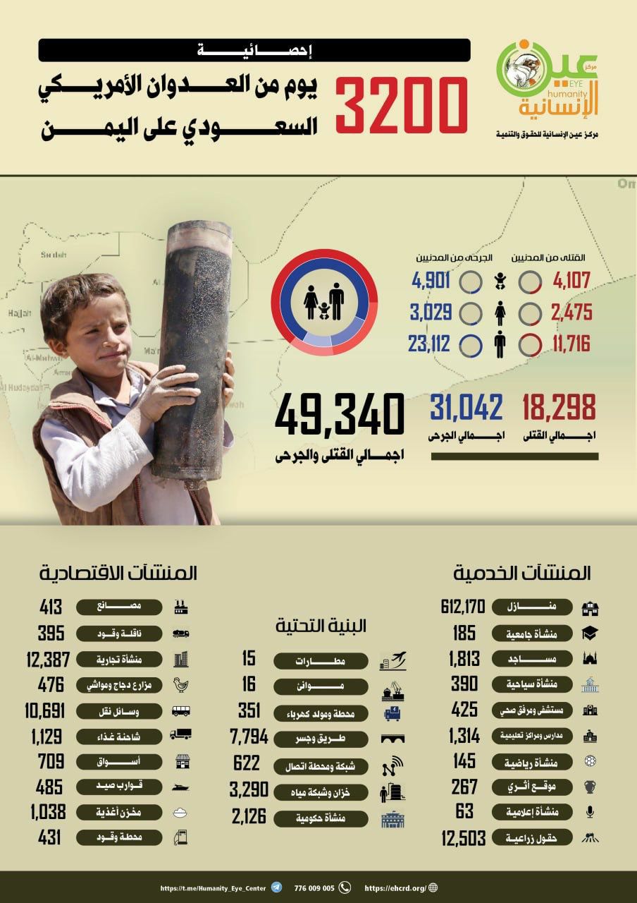 إنفوجرافيك | عين الإنسانية ينشر إحصائية 3200 يوم من العدوان على اليمن