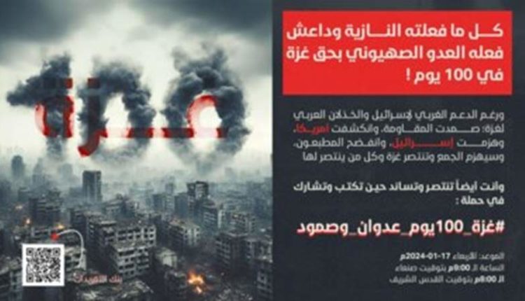 ودعا المنظمون إلى المشاركة الواسعة في الحملة لإبراز جرائم العدوان الصهيوني الأمريكي وصمود أبناء غزة والمقاومة على مدى 100 يوم رغم الدعم الغربي والخذلان العربي، وذلك على هاشتاق: #غزة_100يوم_عدوان_وصمود
