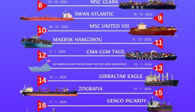وردنا قبل قليل: حصاد اصطياد السفن الاسرائيلية والامريكية في البحر الاحمر On يناير 31, 2024 423 Share أفق نيوز | حصاد عمليات اصطياد القوات المسلحة اليمنية في البحر الأحمر وخليج عدن، انتصارًا ودعمًا واسنادا لإخواننا في غزة فلسطين وردًا على العدوان الامريكي البريطاني. 423 Share FacebookTwitterGoogle+ReddItWhatsAppPinterestEmail
