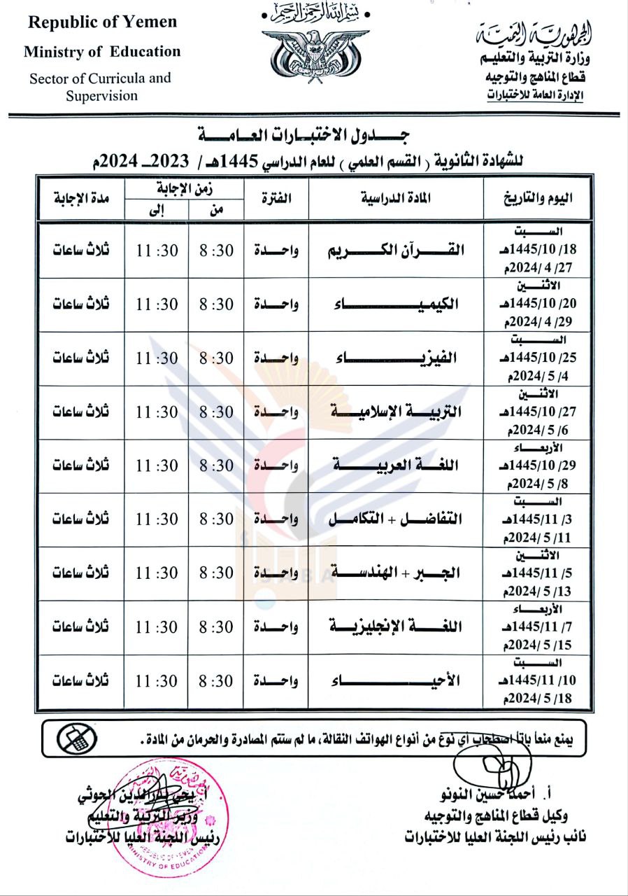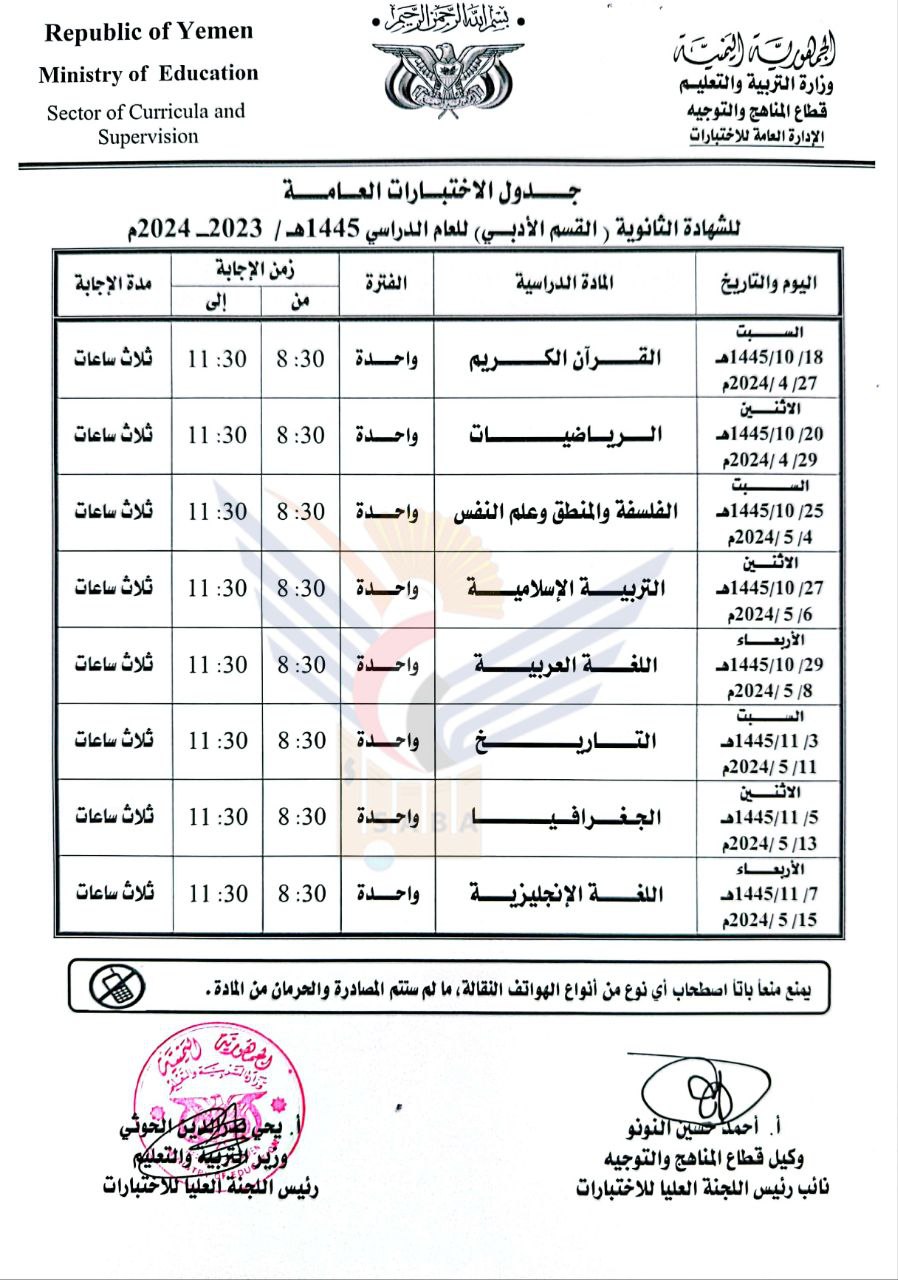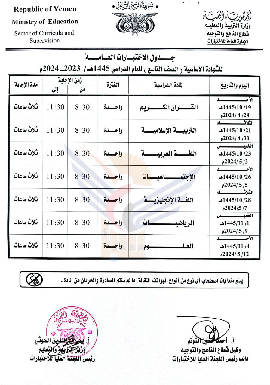 أفق نيوز | أعلنت وزارة التربية والتعليم جداول الاختبارات النهائية للشهادة العامة الأساسية والثانوية بقسميها العلمي والأدبي للعام الدراسي 1445هـ.