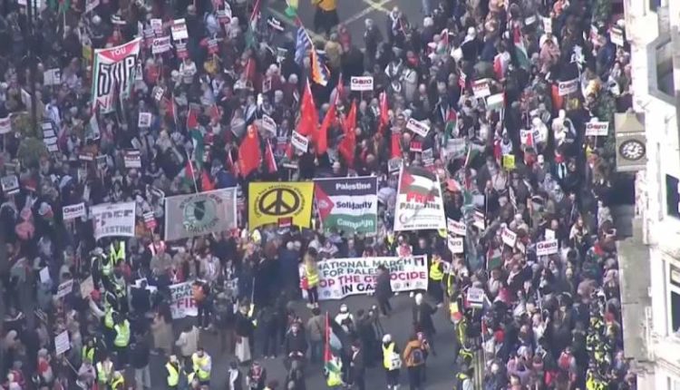 تظاهر الآلاف في العاصمة البريطانية لندن مطالبين بوقف العدوان الصهيوني على قطاع غزة وذلك في تحرّك هو الحادي عشر الذي تشهده العاصمة منذ السابع من أكتوبر الماضي.