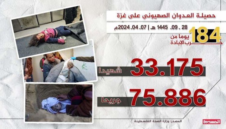 وأوضحت الوزارة أن حصيلة ضحايا العدوان الصهيوني على غزة منذ السابع من أكتوبر ارتفعت إلى 33.175 شهيدا و75.886 إصابة.