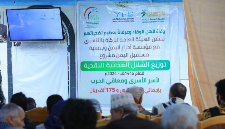 دشنت الهيئة العامة للزكاة بالتنسيق مع مؤسسة أحرار اليمن وجمعية مستقبل اليمن، الإثنين، مشروع توزيع السلال الغذائية النقدية لأسر الأسرى ومعاقي الحرب، بإجمالي 293 مليونا و175 ألف ريال.