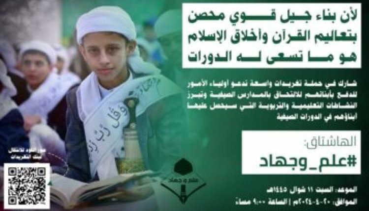 ودعا المنظمون إلى المشاركة الواسعة في حملة التغريدات، لدعوة أولياء الأمور للدفع بأبنائهم للالتحاق بالمدارس الصيفية وإبراز النشاطات التعليمية والتربوية التي سيحصل عليها أبناؤهم في الدورات الصيفية، وذلك على الهاشتاق: #علم_وجهاد.