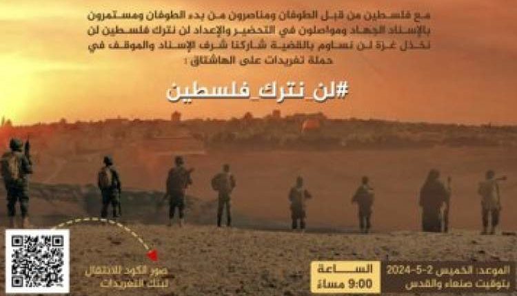 تنطلق في الساعة التاسعة من مساء يوم غدٍ الخميس حملة التغريدات عبر موقع التواصل الاجتماعي “تويتر”، بعنوان “مع فلسطين من قبل الطوفان ومناصرون من بدء الطوفان ومستمرون بالإسناد الجهاد ومواصلون في التحضير والإعداد”.