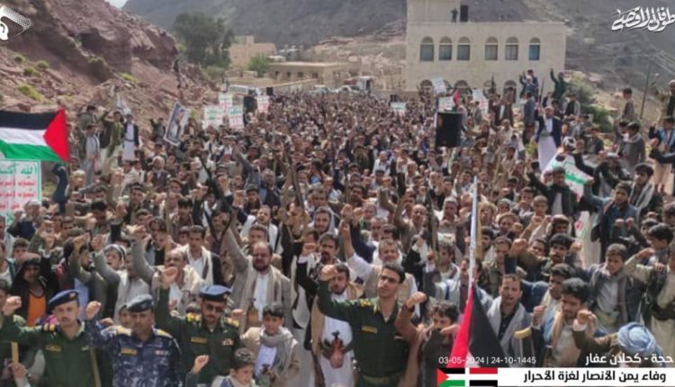 وحيا المشاركون في المسيرات العمليات النوعية للقوات المسلحة اليمنية ضد الكيان الصهيوني الغاصب والعدو الأمريكي البريطاني في باب المندب والبحرين الأحمر والعربي وخليج عدن والمحيط الهندي.