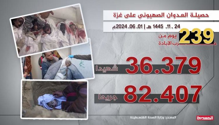 وفي التقرير الإحصائي اليومي لعدد الشهداء والجرحى جراء العدوان الاسرائيلي المستمر لليوم ال 239 على قطاع غزة، أفادت الوزارة بارتفاع حصيلة العدوان الصهيوني إلى 36 ألفا و379 شهيدا و82 ألفا و407 مصابا منذ السابع من أكتوبر الماضي.