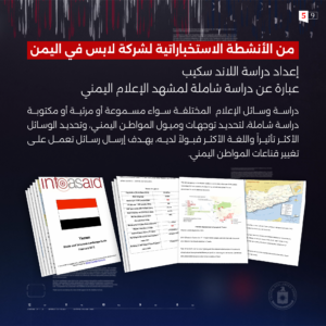 أيضاً من الأنشطة التي قامت بها شركة “لابس” -كما يقول الجاسوس عزان- إعداد الحملات الإعلامية، وتنفيذ الحملات الإعلامية الواسعة، وذلك بالاعتماد على نتائج دراسات، ومسوح المشهد الإعلامي اليمني المعروف باللاند سكيب الذي كان يعطينا مؤشرات عن الوسائل الإعلامية الأكثر قرباً للمواطن اليمني، والأكثر شعبية إذا جاز التعبير واللغة المحببة له والأكثر قبولاً للمواطن اليمني، وذلك بغرض التأثير عليه، وتغيير قناعاته في مواضع معينة، لافتاً إلى أنه تم استخدام في سبيل ذلك الوسائل الإعلامية المختلفة من مقروءة ومكتوبة ومسموعة ومرئية وحتى إلكترونية، و من وسائل التواصل الاجتماعي وغيرها.